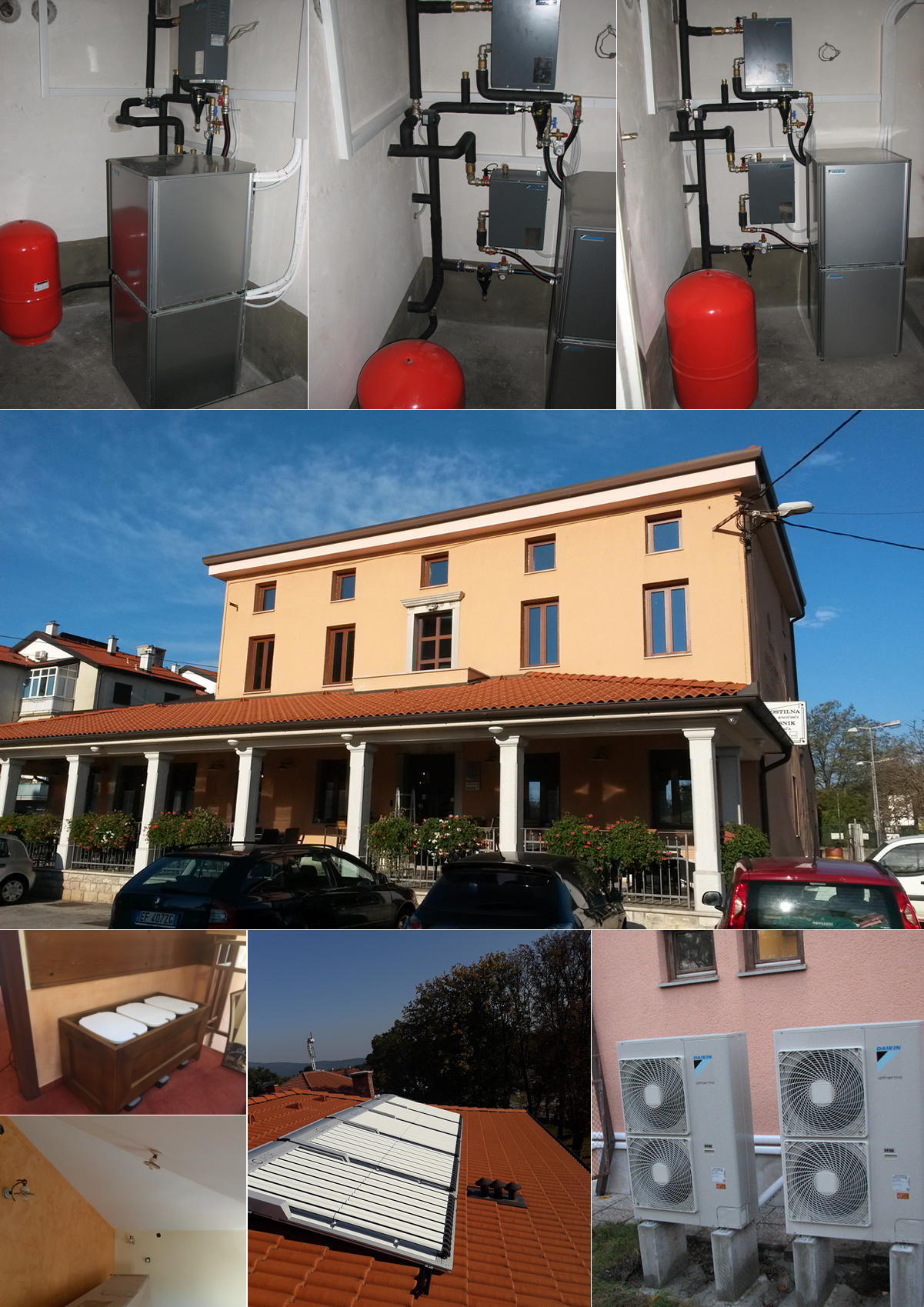 Na objektu smo staro in dotrajano stavbno pohištvo (35 oken in 1 vrata) zamenjali z novimi sodobnimi troslojno zastekljenimi okni. Okna imajo toplotno prehodnost zasteklitve U=0,6W/m2K. Zamenjala se je tudi streha nad nižjim delom objekta, nad delom gostišča in kuhinje – dodatno smo toplotno izolirali / prekrili z izolativnimi strešnimi paneli (ca 102 m2). Namestili smo novo sodobno visokotemperaturno toplotno črpalko zrak/voda s COP, ki bo večji od 3,2. Črpalka je namenjena ogrevanju objekta in pripravi sanitarne tople vode. Zamenjali smo tudi radiatorje po vseh prostorih (42 kom) saj obstoječi niso bili primerni za ogrevanje s toplotno črpalko. Nove radiatorje smo prilagodili temperaturnemu režimu nove toplotne črpalke in s tem optimizirali učinkovitost. Nove radiatorje smo opremili s termostatskimi ventili. Na streho smo namestili cca. 12 m2 sprejemnikov sončne energije (vakumskih), ki so namenjeni pripravi tople sanitarne vode predvsem v poletnih mesecih. Po objektu smo starejše žarnice in ponekod sijalke oz. svetila zamenjali z energijsko učinkovitimi LED sijalkami oz. svetili. Namestili smo tudi senzorje za avtomatski vklop luči po hodnikih in ostalih skupnih prostorih. Gre za zamenjavo 49 kosov luči in 35 m led traku ter 23 žarnic. Svetilka LED namreč porabi tudi do 40-krat manj električne energije kot primerljivo svetla navadna ali halogenska žarnica. Poleg tega je njena življenjska doba do 1000-krat daljša.